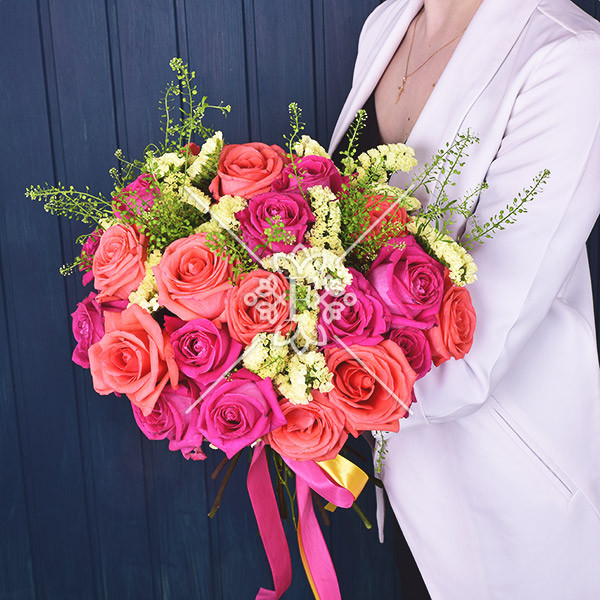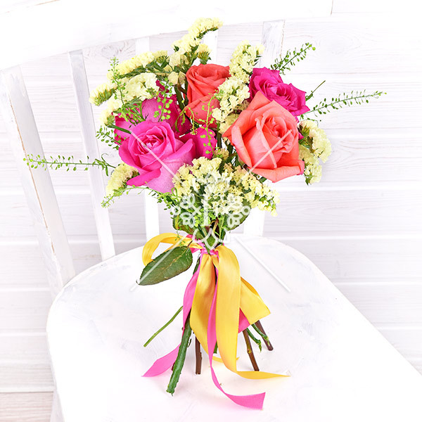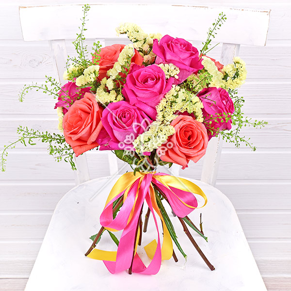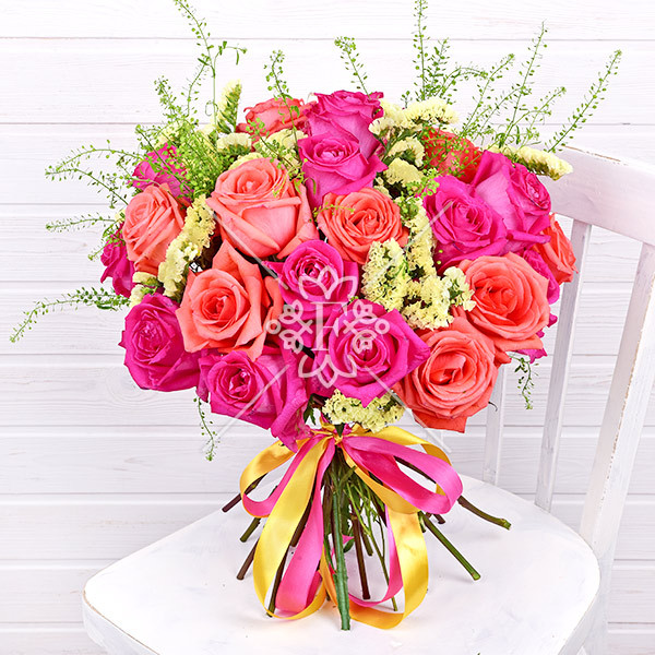 Букет «Искры счастья» из насыщенно-розовых и нежно-коралловых роз, в сочетании с ванильного цвета статицей, несомненно, будет принят благосклонно и с радостью!